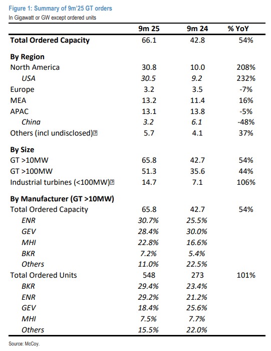 2025年前9个月,全球燃气轮机订单以吉瓦(GW)计算同比增长54%,其中美国订单量受数据中心强劲需求支撑,同比激增超过200%,从一年前的9.2 GW增至30.5 GW。