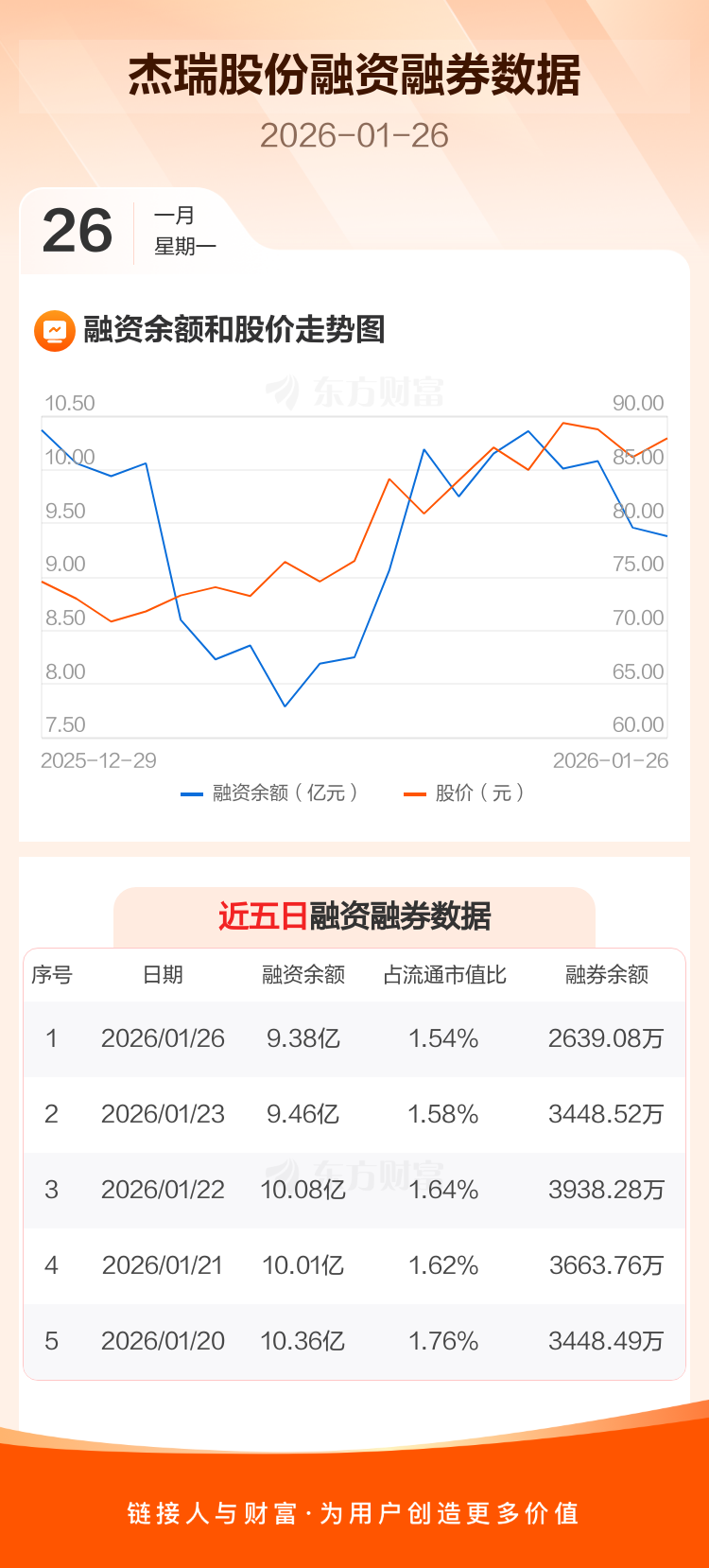 交易所最新数据显示,杰瑞股份于2026年1月26日获融资买入9754.99万元,融资偿还1.06亿元,当日融资净偿还840.91万元。目前,该股融资余额9.38亿,占流通市值比例为1.54%。