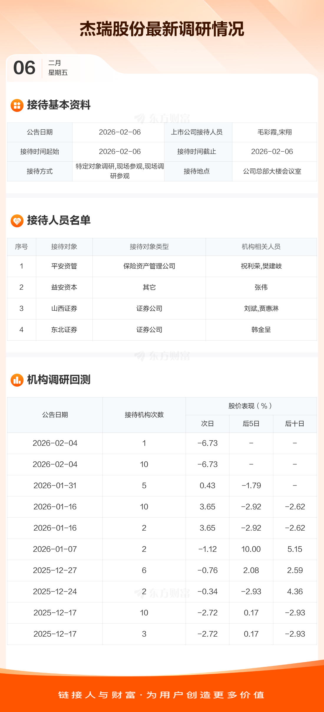 杰瑞股份2月6日公告称,2月6日接待平安资管等4家机构调研。接待人员包括毛彩霞,宋翔。