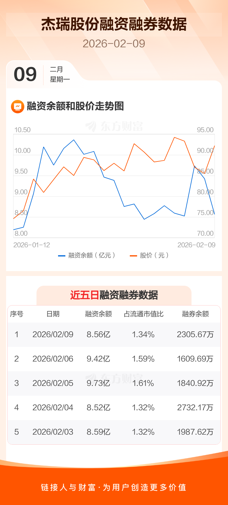 交易所最新数据显示,杰瑞股份于2026年2月9日获融资买入1.08亿元,融资偿还1.94亿元,当日融资净偿还8631.15万元。目前,该股融资余额8.56亿,占流通市值比例为1.34%。