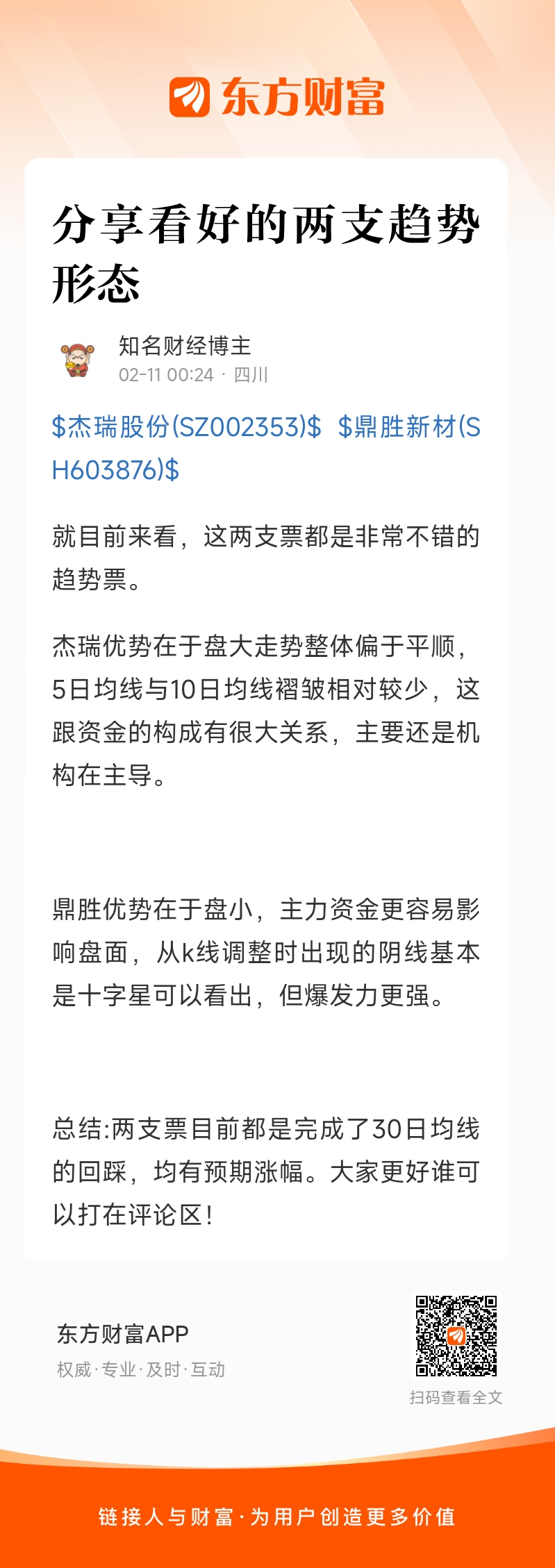 总结:两支票目前都是完成了30日均线的回踩,均有预期涨幅。大家更好谁可以打在评论区!