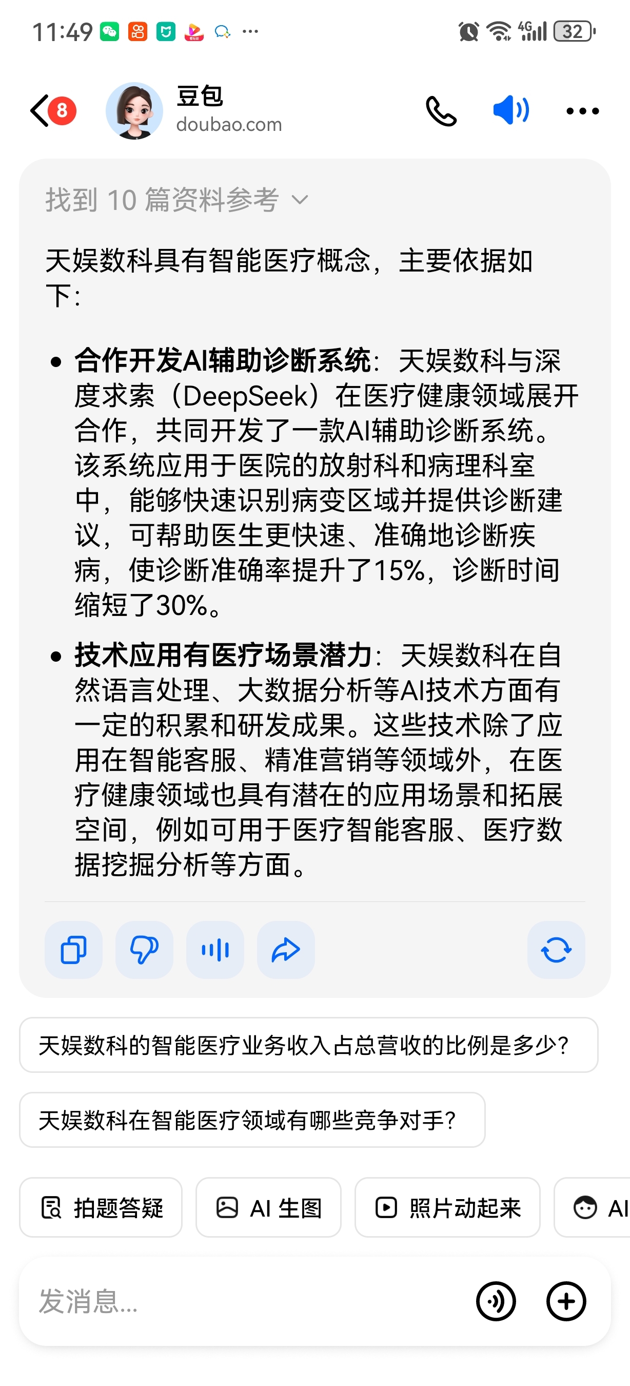 实锤了,根据豆包的回答,天娱数科有AI智能医疗概念!