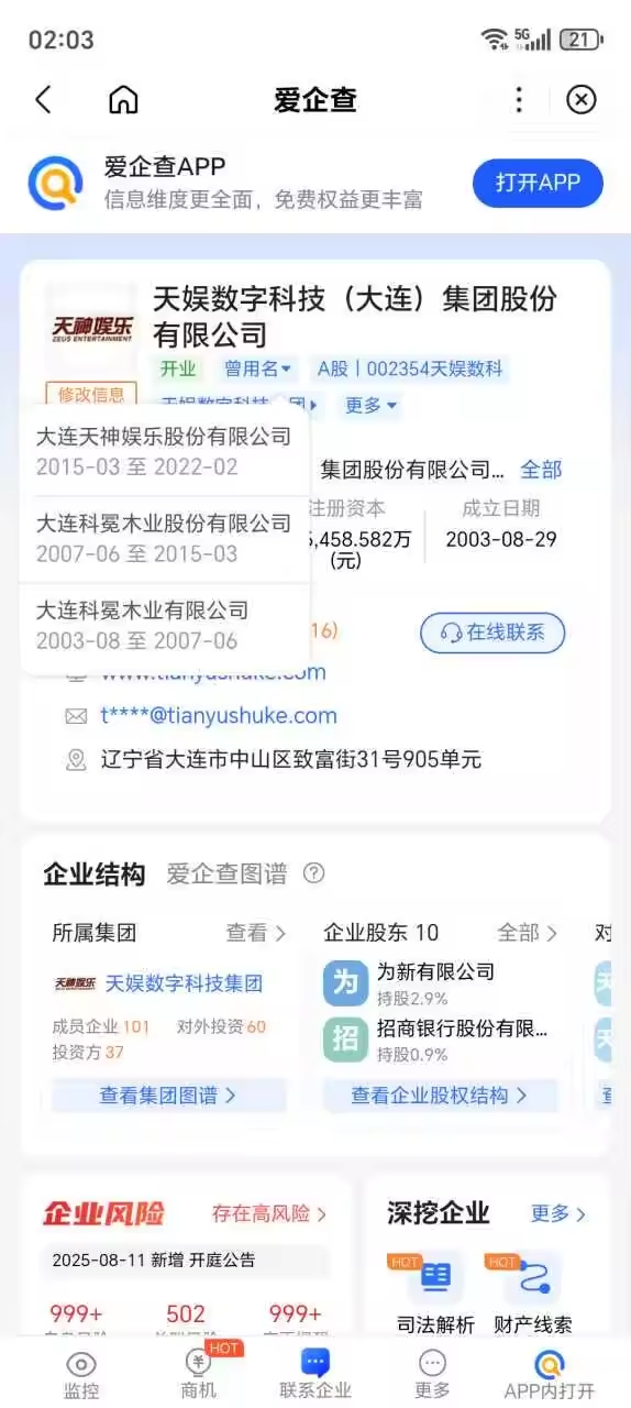 $天娱数科(SZ002354)$ 天娱数科是大连的公司,跟芒果超媒下的天娱传媒有啥关系,大家理智一点别被忽悠了