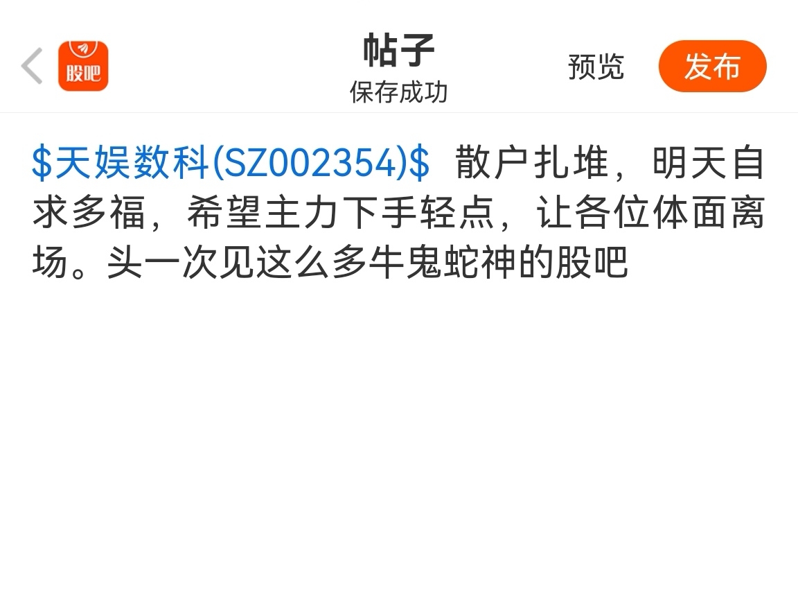 $天娱数科(SZ002354)$ 我昨天下午发的帖子,结果发不出去