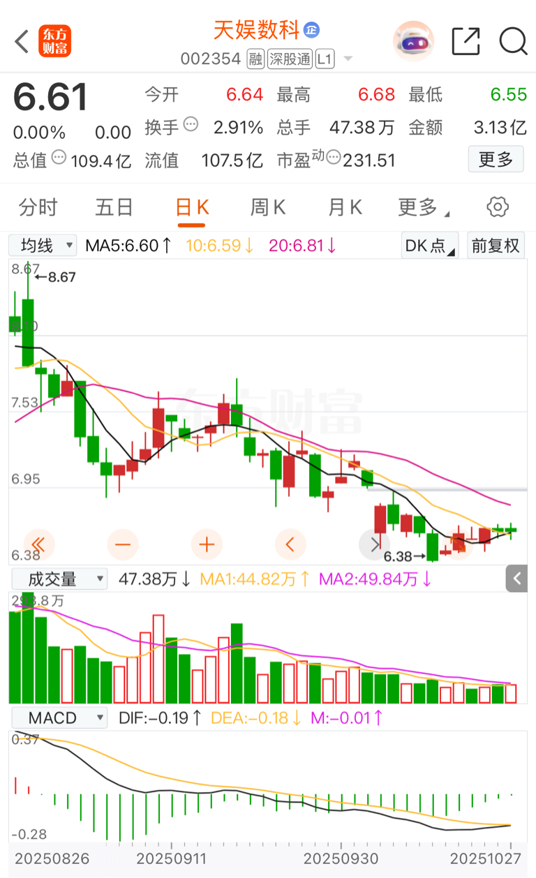 $天娱数科(SZ002354)$ 整整两个月,一步一个台阶,下坡路走的很坚决、很稳健。