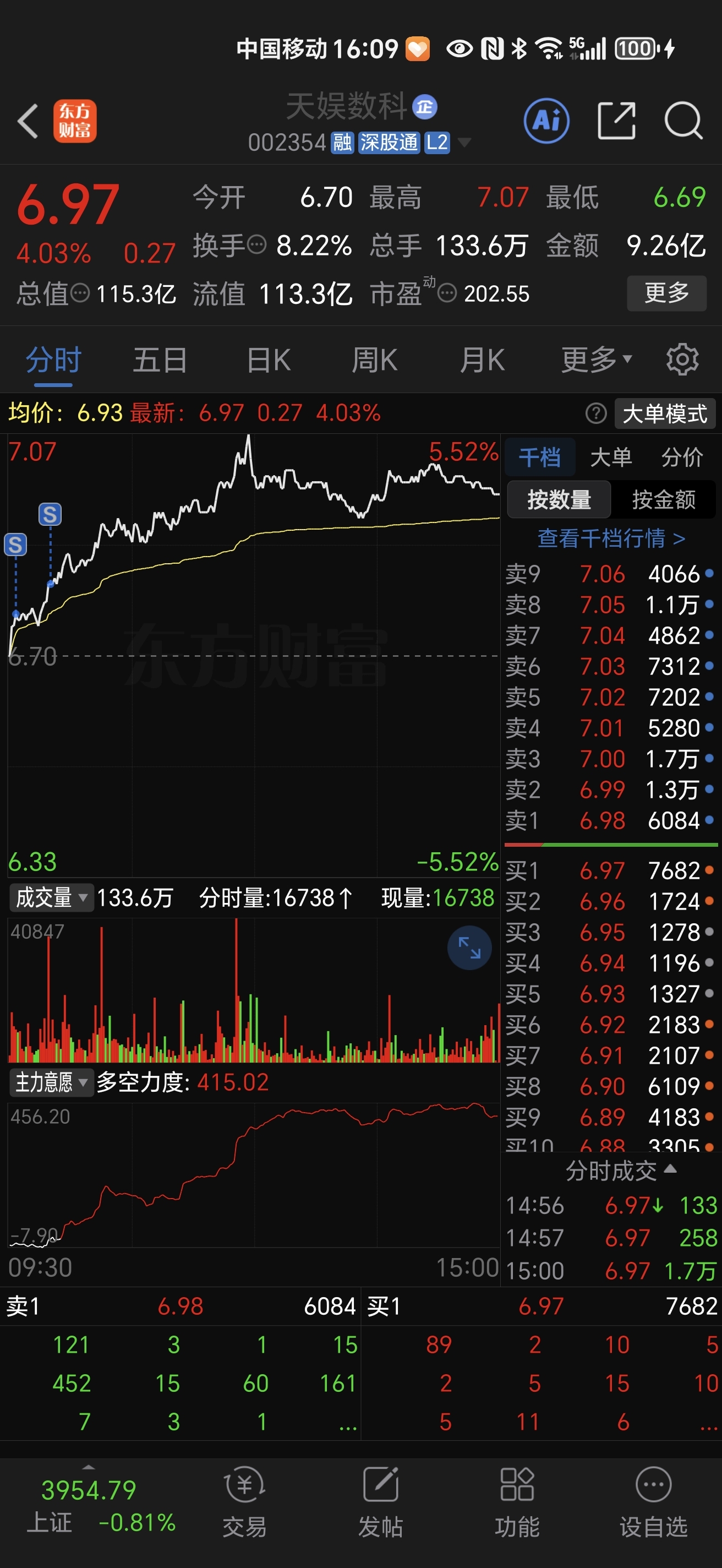 $天娱数科(SZ002354)$ 出乎意料,今天涨5个点,我还以为慢慢往上拉,估计下周要调整,择机而入,又是喝汤的日子