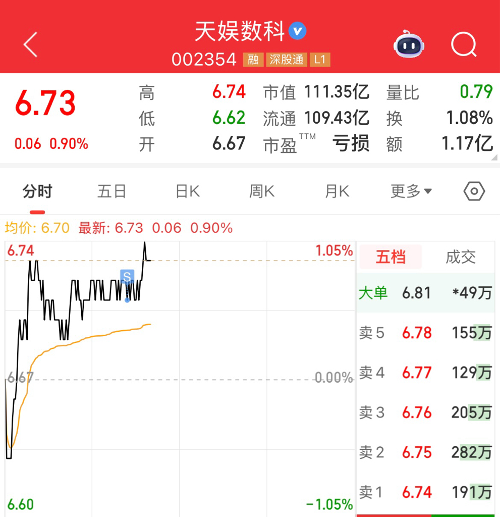 $天娱数科(SZ002354)$ 好家伙多等1分钟能多T1分钱,一直挂单6.73卖不出去,干脆7.41卖了就拉了