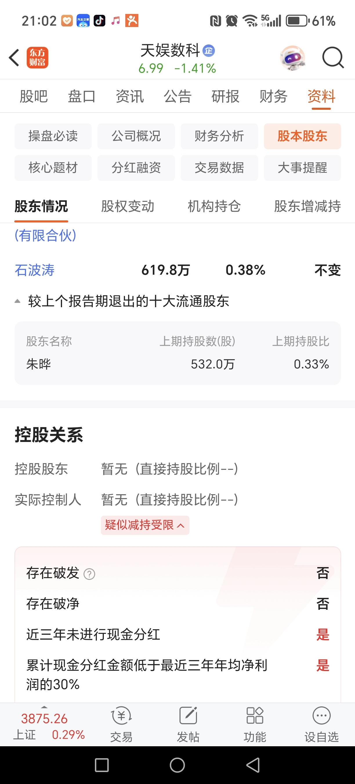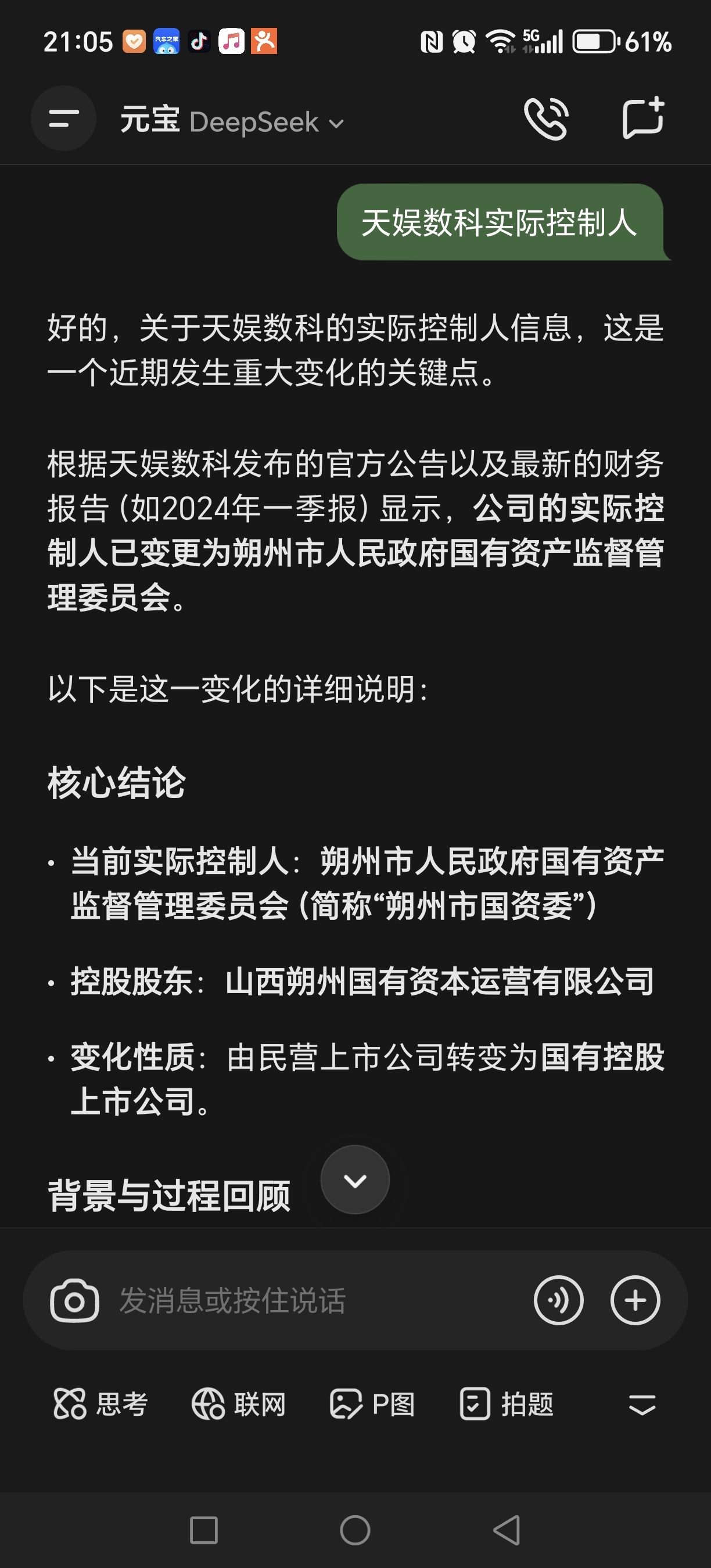 天娱数科有国资背景有实际控制人,为什么显示没有实际控制人?