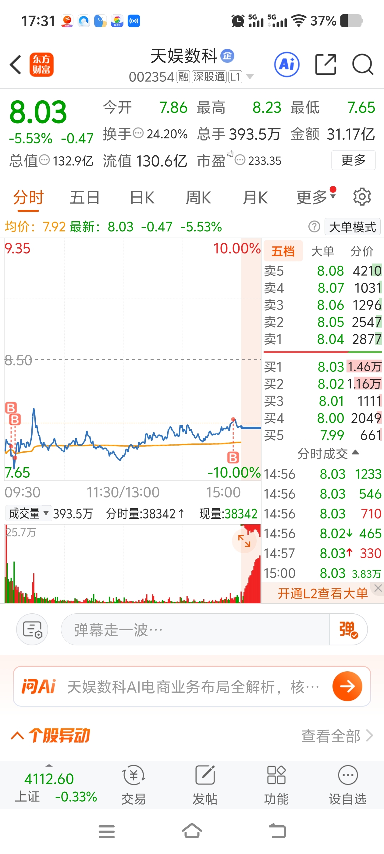 $天娱数科(SZ002354)$ 第一次搞乌龙了,尾盘是卖的,搞成全仓买入。