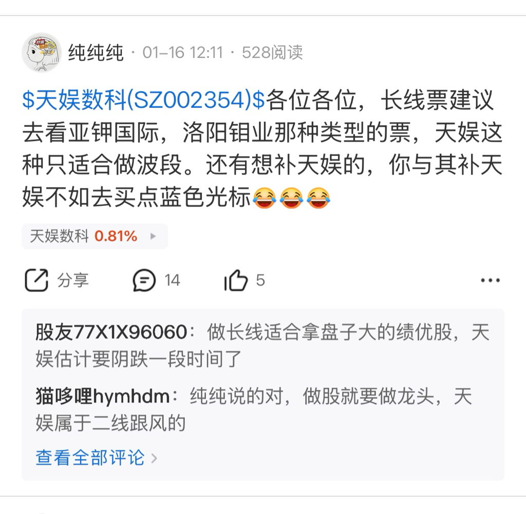 $天娱数科(SZ002354)$ 亚钾国际太高了,不建议去入了,至于蓝色光标,蓝色没有底仓的也不要去了,至于天娱,天娱挺好的,天娱这货只能跟着量化一起做T,天娱是一个教人学习做t的股。