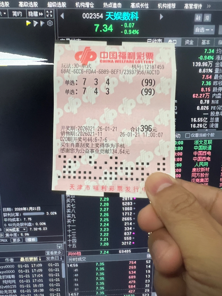 $天娱数科(SZ002354)$ 今天T的收盘没买回,买张彩票试试开奖也许是734