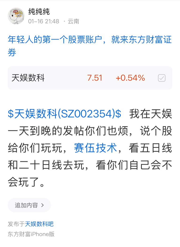 $天娱数科(SZ002354)$ 别说我马后炮,自己去看时间,炒股要的是耐心和选票能力,在赛伍技术的,有盈利的该走的可以走了,没有筹码的也别去追高了,我已经提醒过了,是卖是留你们自己选择,后面追高亏了的别来骂我,在这里提醒过了。