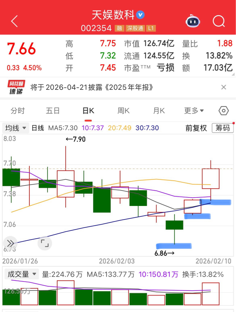 $天娱数科(SZ002354)$ 还是这里热闹,天娱上周五收了根中阴线探底6.86就止跌了,这周一收了根小阳线确认止跌开始反攻,昨天又是一根中阳线,并且放量了,趋势转多。今天要是再来根大阳线就nice了。
