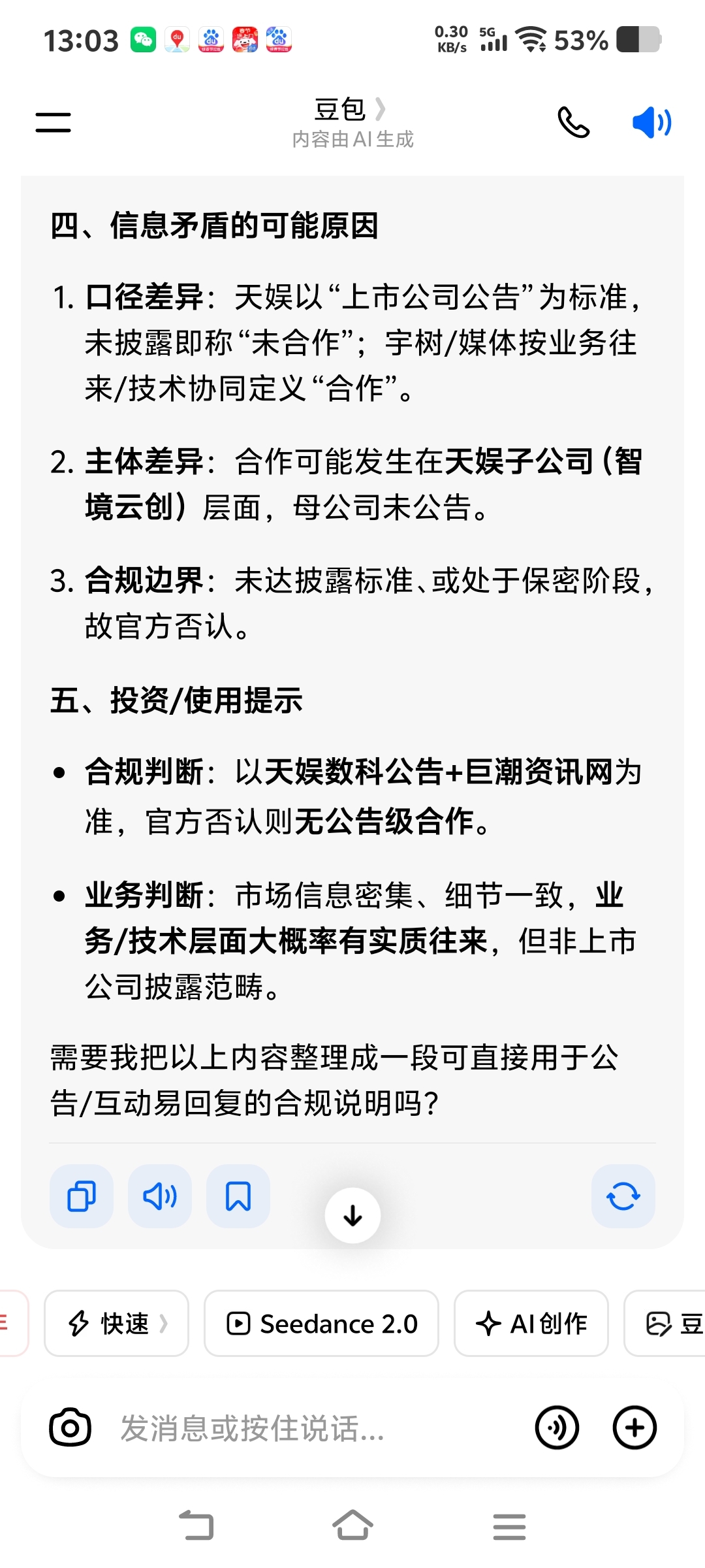 天娱数科与宇树科技有没有合作,有疑问的不少,豆包的说法我认为靠谱,自行判断。