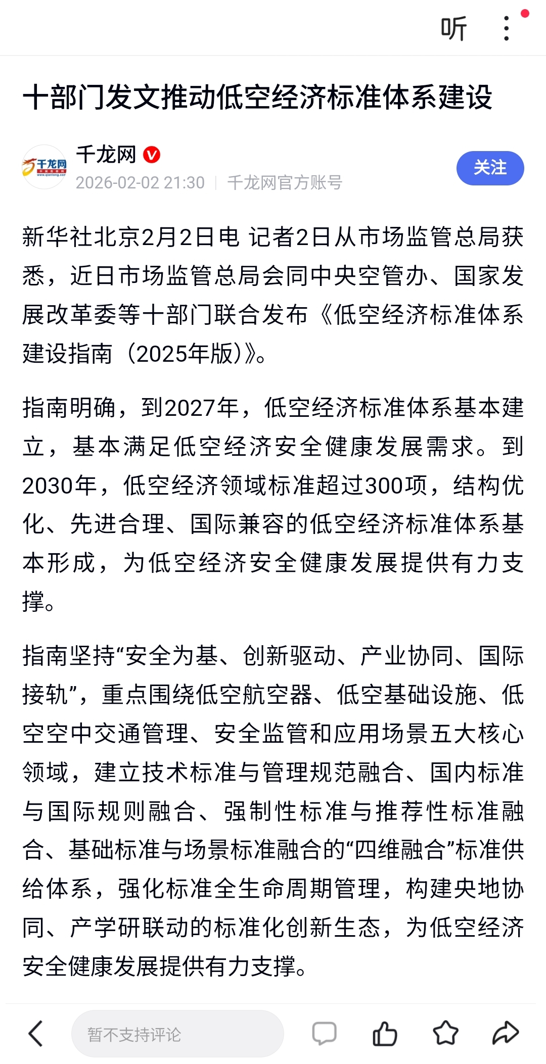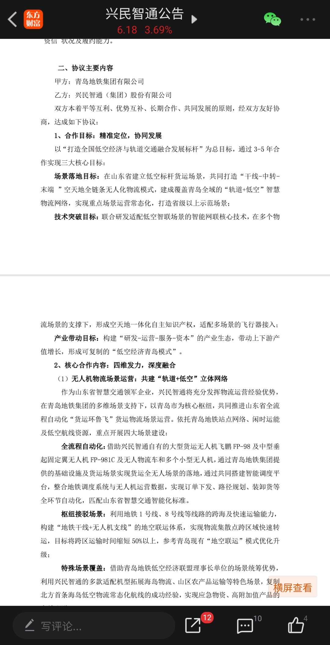 $兴民智通(SZ002355)$ $万丰奥威(SZ002085)$ $纵横股份(SH688070)$ 兴民智通与青岛地铁集团联合打造全国低空经济与轨道交通融合发展标杆项目。在山东省建立低空标杆货运场景,“干线-中转-末端 ”空天地全链条无人化物流模式,建成覆盖青岛全域的“轨道+低空”智慧物流网络,实现重点场景运营常态化,打造省级以上示范场景;借助兴民智通自有的大型货运无人机飞鹏FP-98及中型垂起固定翼无人机FP-981C及无人物流车和多个小型无人机,通过青岛地铁集团提供的基础设施及货运场景实现货运全无人场景的落地。(2月3日低空经济板块可能会是主线,史上最高规格十部门全国范围推广落地相关政策措施。2月2日资金先知先觉?)