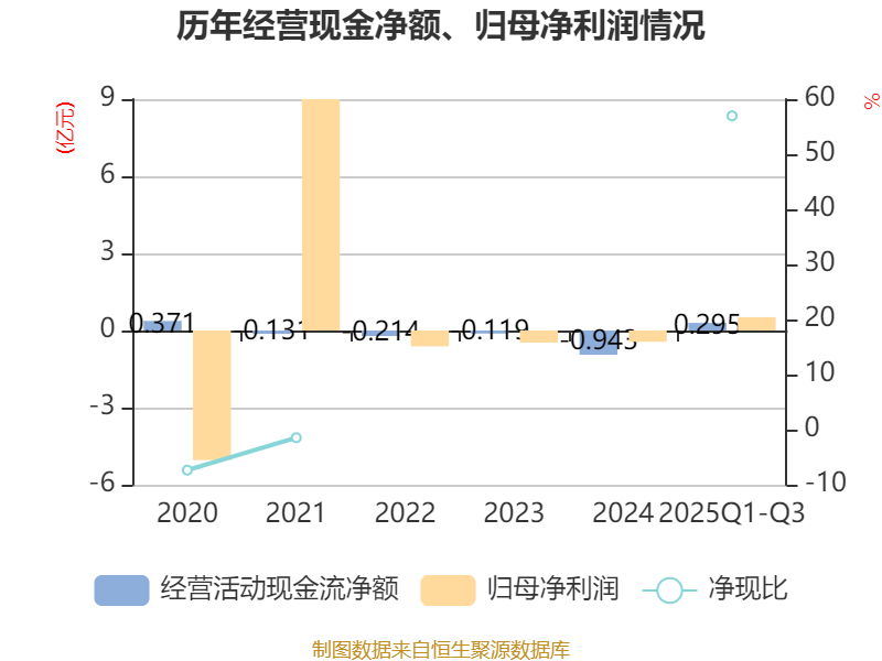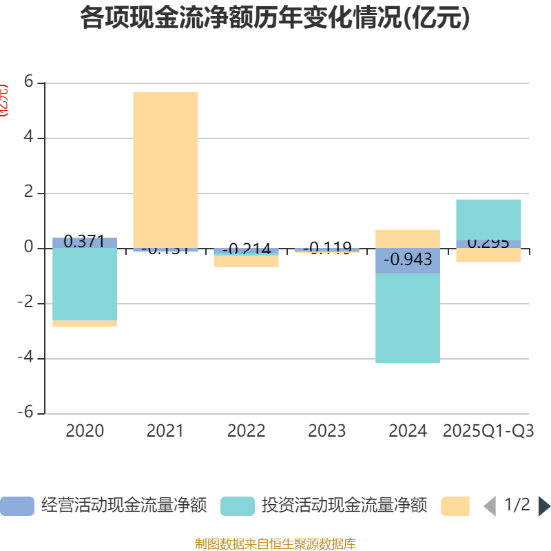2025年前三季度,公司经营活动现金流净额为2948.33万元,同比增加1.38亿元;筹资活动现金流净额-5063.98万元,同比减少9235.55万元;投资活动现金流净额1.46亿元,上年同期为-2.13亿元。