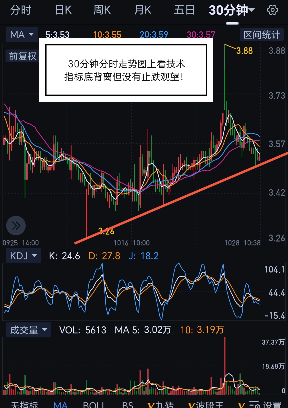 今天$赫美集团(SZ002356)$互动平台董秘回答投资者提问也无法止跌,因此操作上还是观望为主,至于黑粉捣乱没有用,本来就是关注一下我没有让大家买,技术上分析,从下图30分钟分时走势图上看已经有点底背离但没有止跌迹象,低价股最近龙头$盈新发展(SZ000620)$继续涨停,$平潭发展(SZ000592)$有后来居上势头。