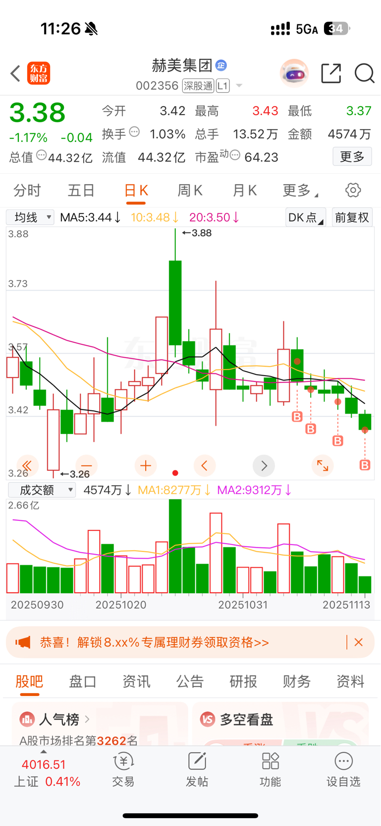 $赫美集团(SZ002356)$ 对不起大家,自从我买入以后就一直跌,等我卖的时候通知大家一声,你们再抄底