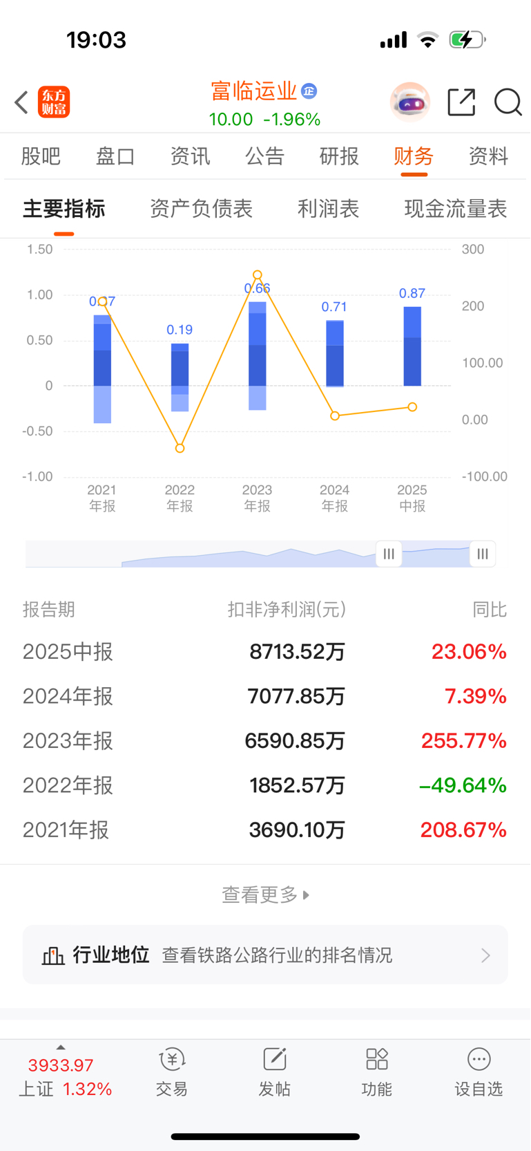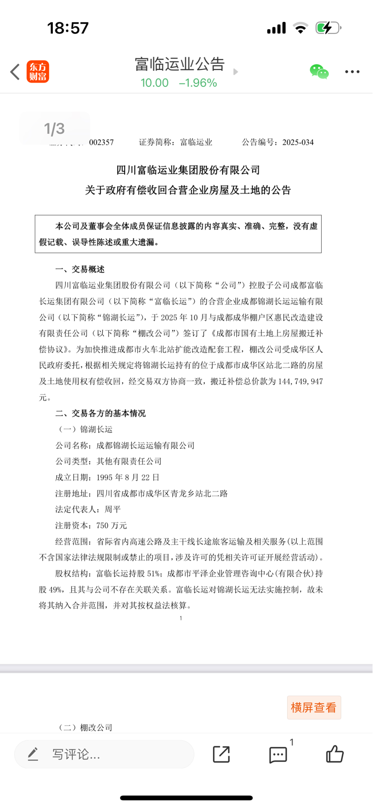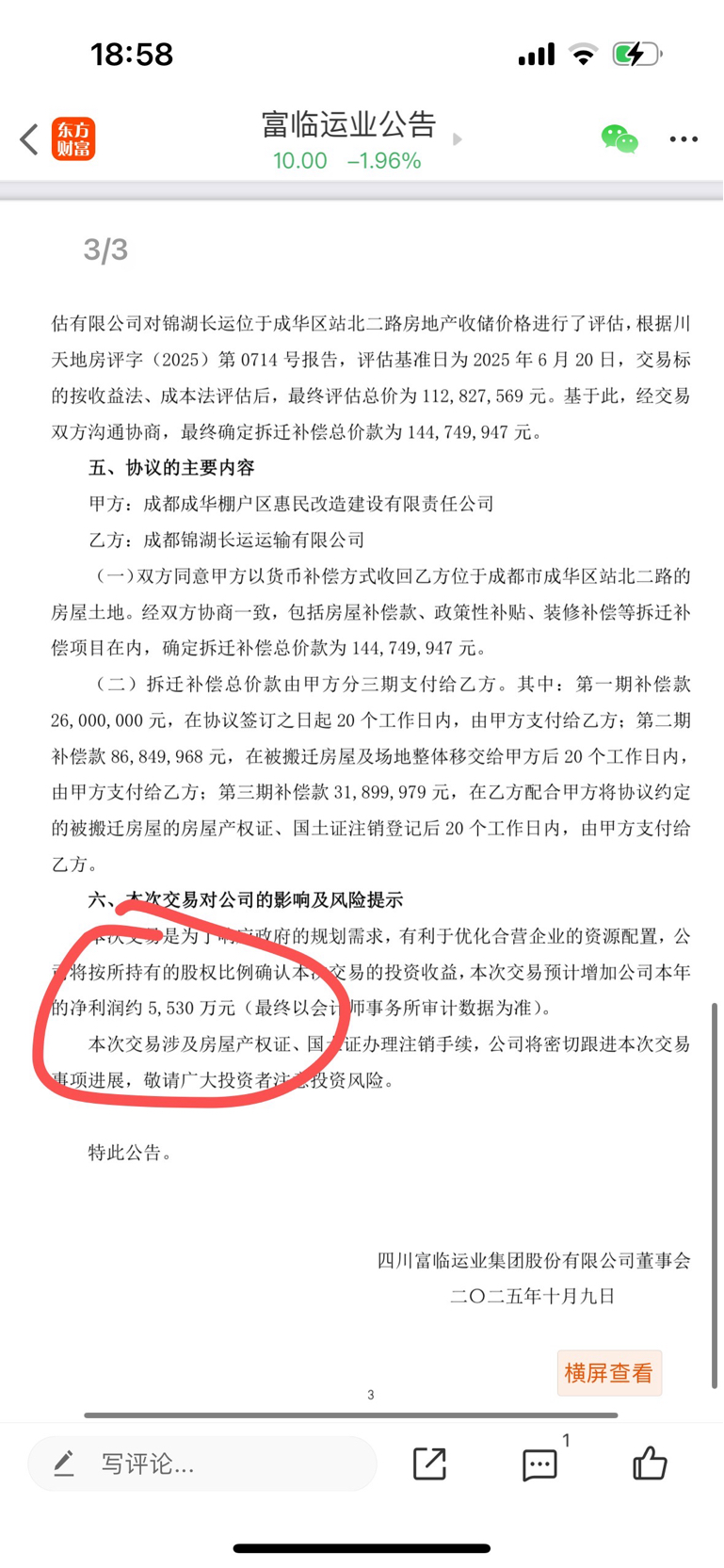 子公司获得一次性补偿近1.5亿,富临运业控股51%,间接获利大概有几千万,接近2