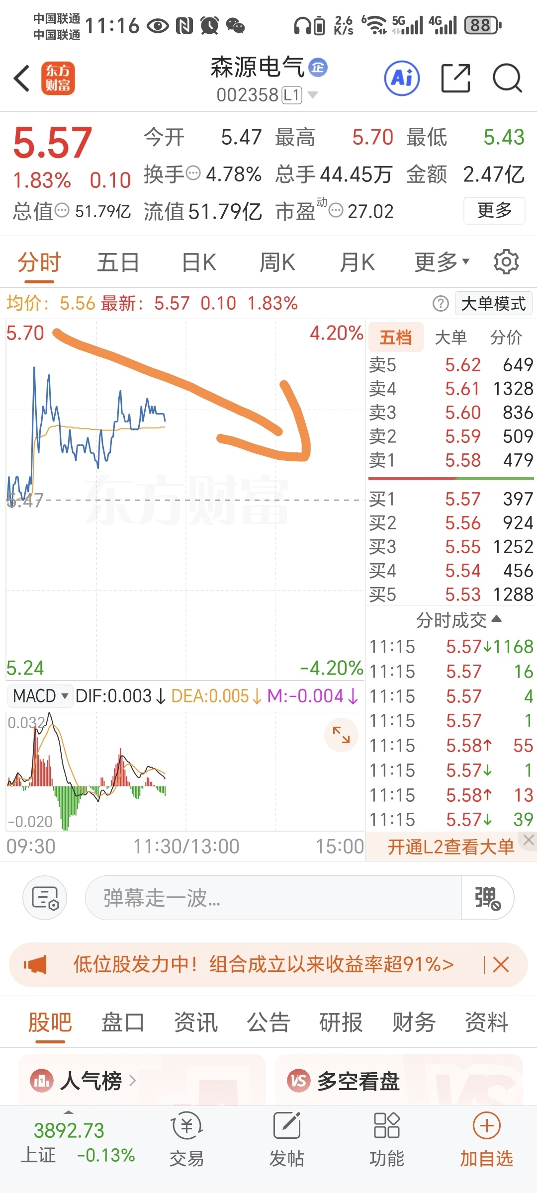 $森源电气(SZ002358)$ 点越来越低,收于5.60下