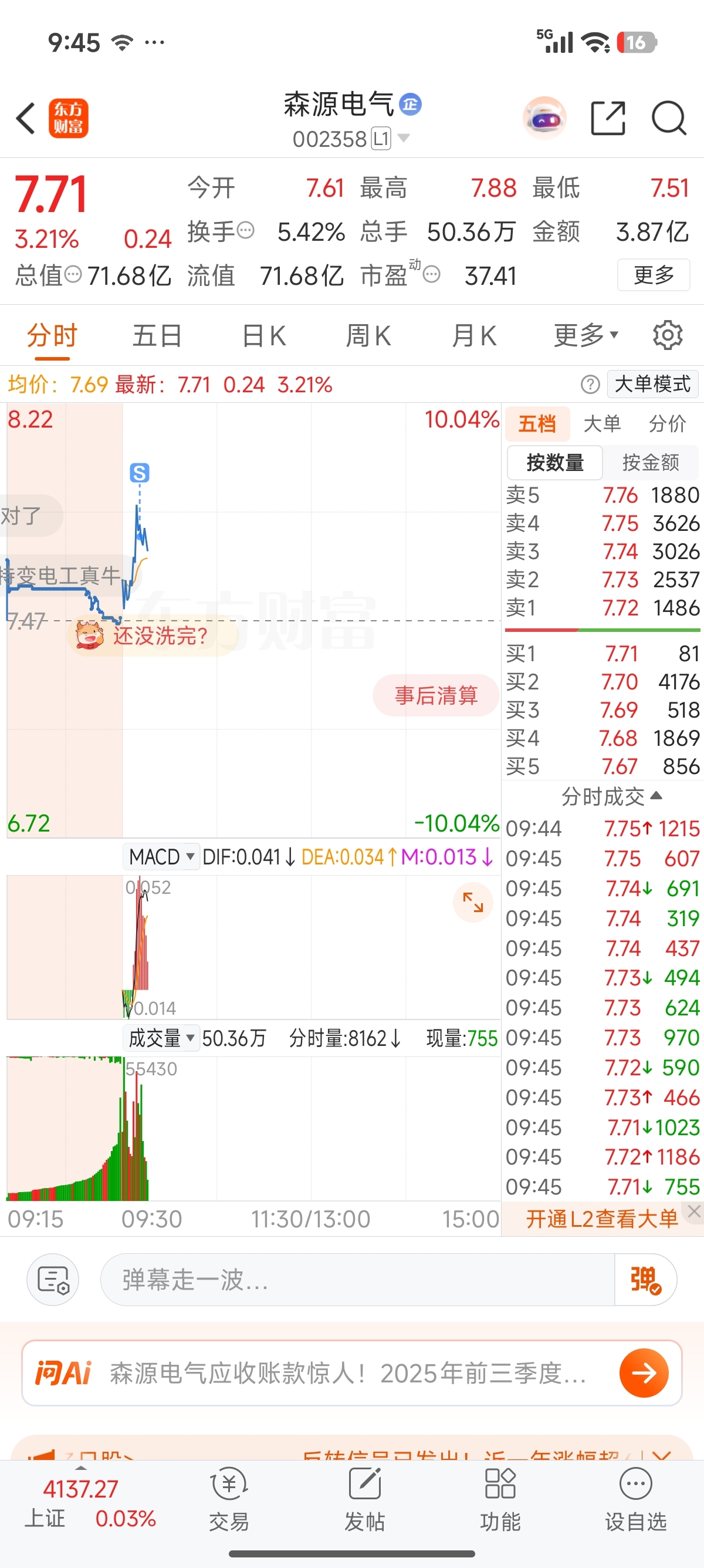 $森源电气(SZ002358)$ 汉揽上板60万手爆头