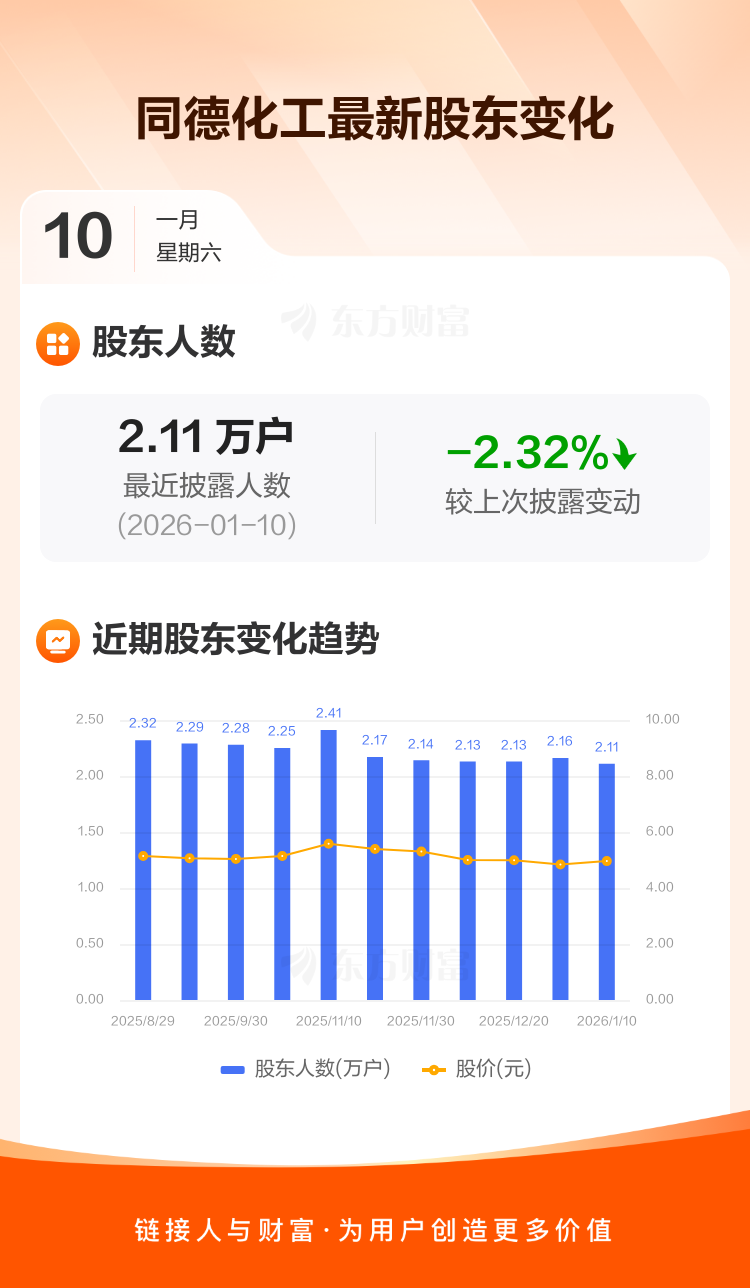 同德化工:截至1月10日最新股东户数2.11万户,较上期减少2.32%