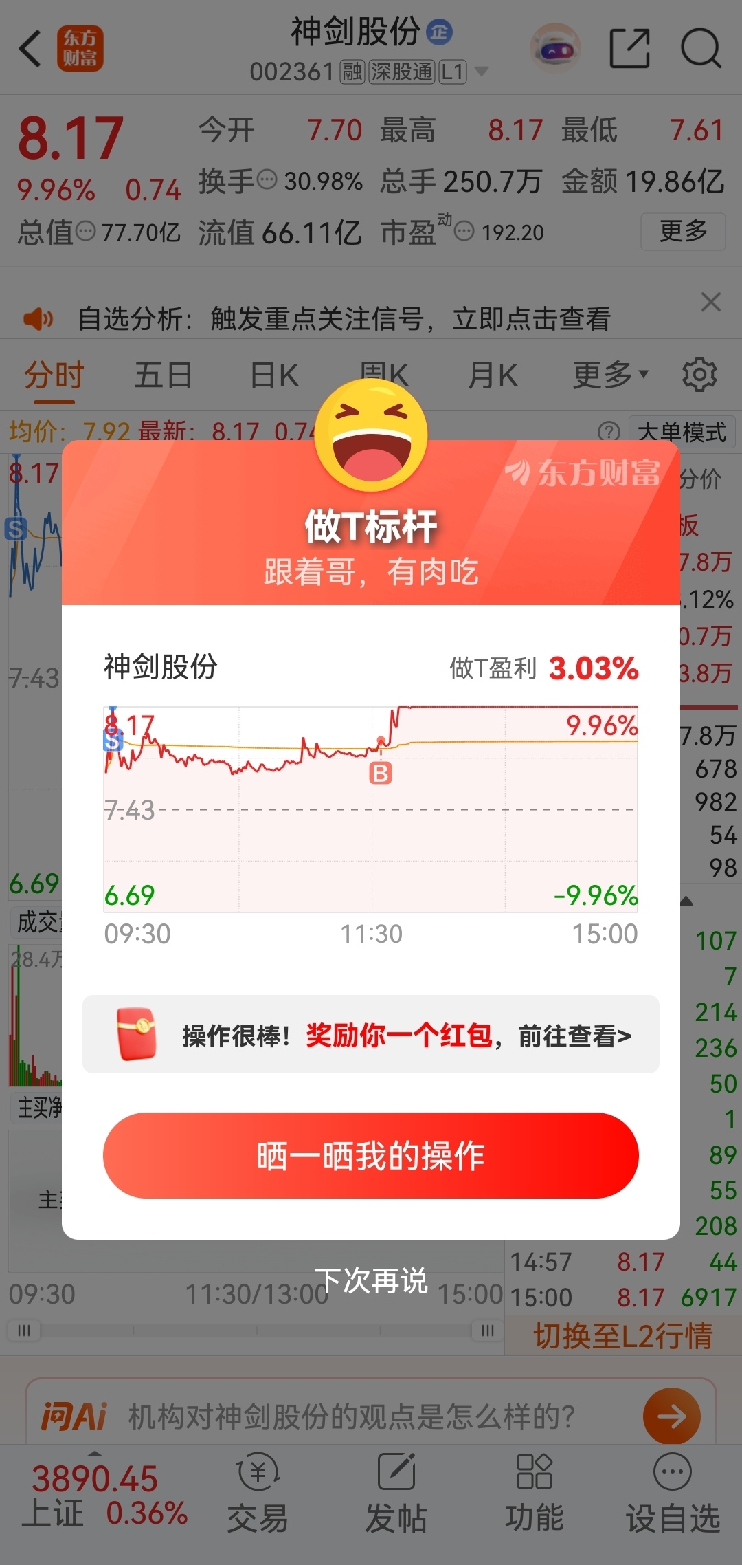 $神剑股份(SZ002361)$ 今天做T成功了一次。