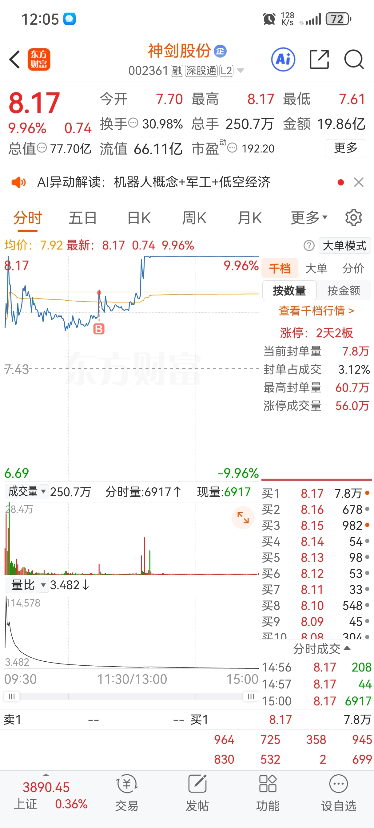 $神剑股份(SZ002361)$ 目前已经突破近几年的前高了,感觉周一不会那么容易上涨的,肯定会先往下去一波,让获利盘走一部分。然后迅速拉高