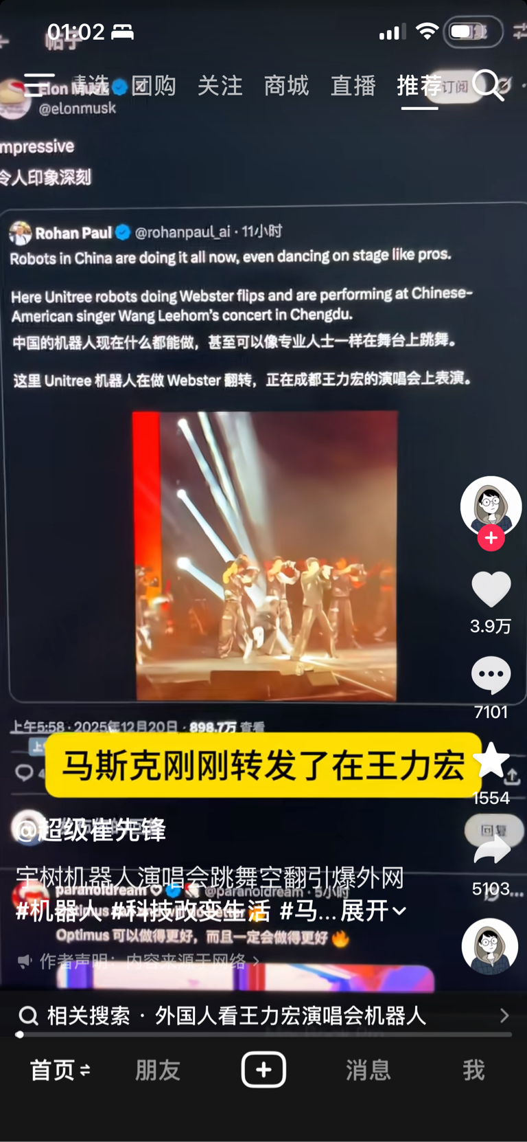 $神剑股份(SZ002361)$ 马斯克转发中国机器人跳舞