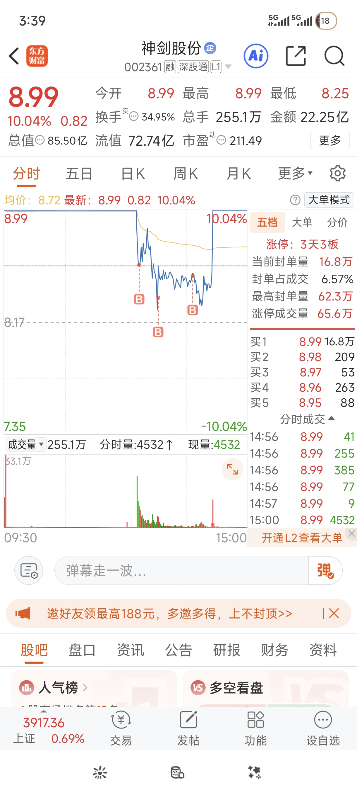 $神剑股份(SZ002361)$ 卖了永辉,买了你,希望明天有个不错的溢价