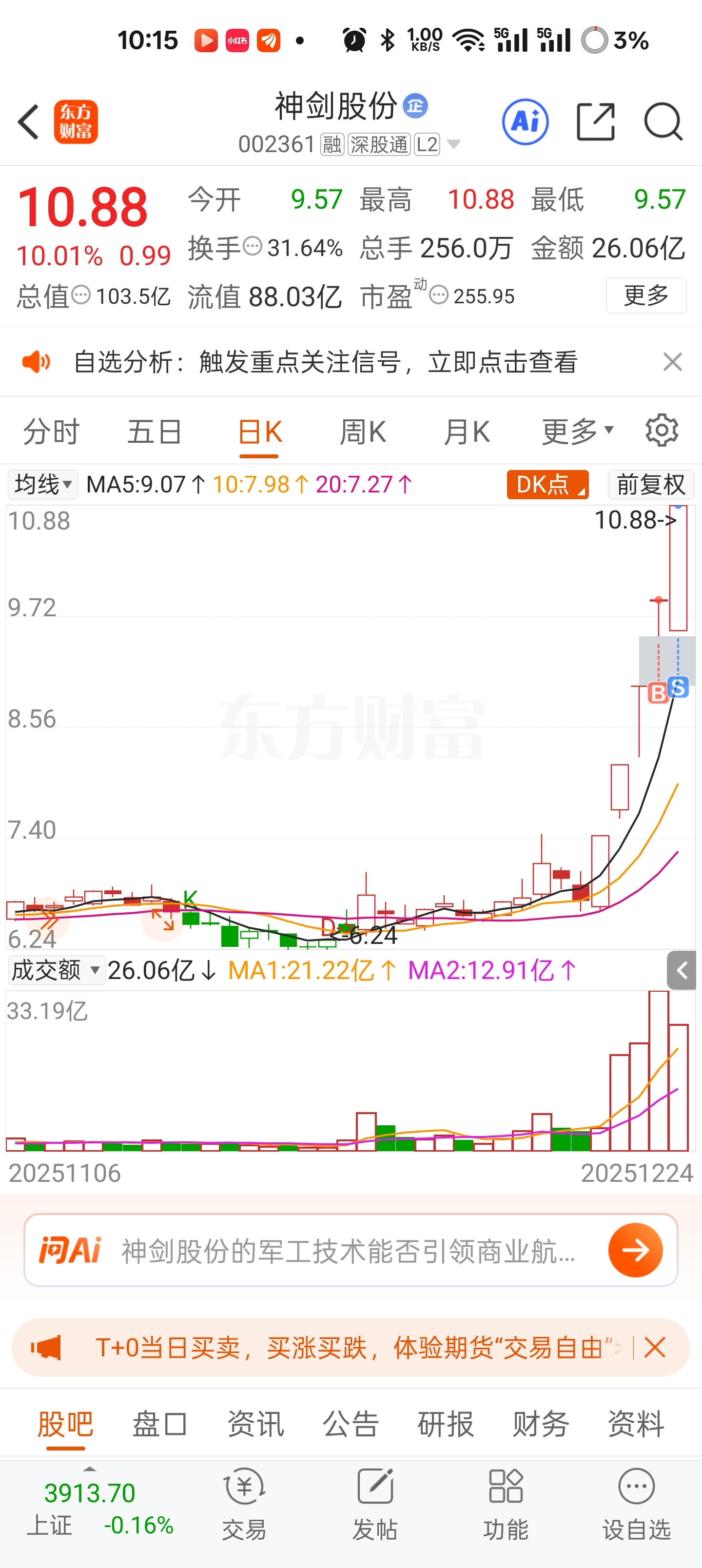 $神剑股份(SZ002361)$ 昨天进的,留下发财。