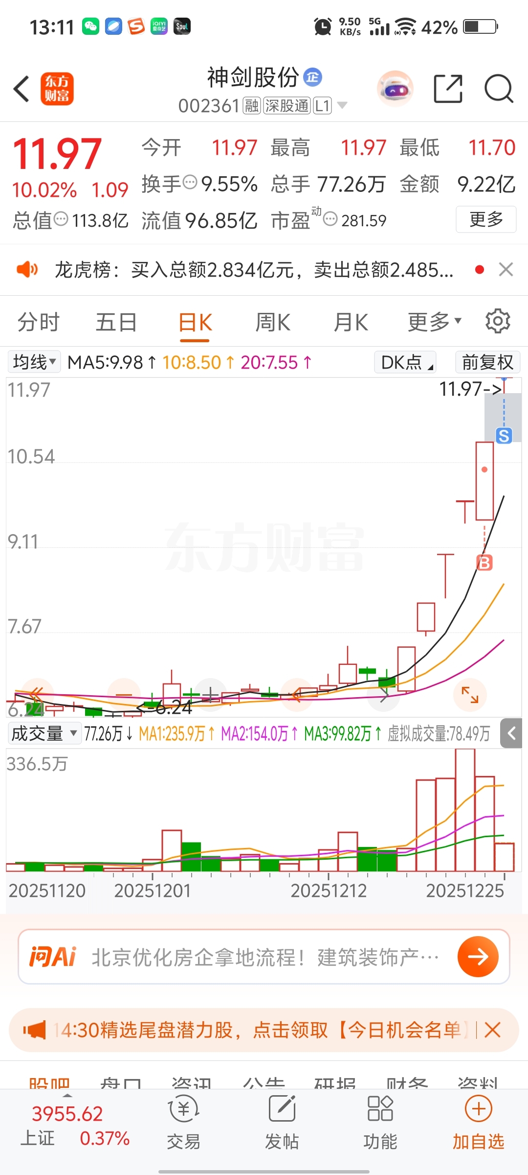 $神剑股份(SZ002361)$ 昨天的强度知道今天必板,迫于生活,舍不得,出了也是无奈之举