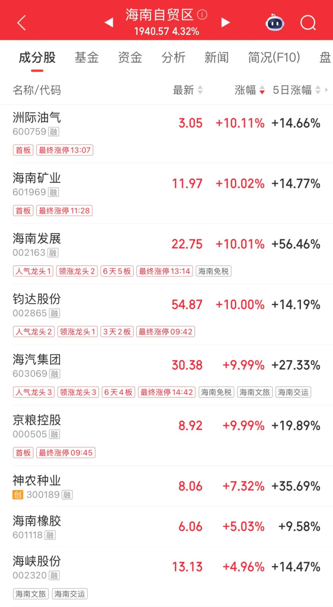 今天,海南概念股再度大涨。同花顺数据显示,截至收盘,海南自贸区、海南板块大涨超4%,领涨所有行业、概念板块。洲际油气、海南矿业、海南发展等多股涨停。