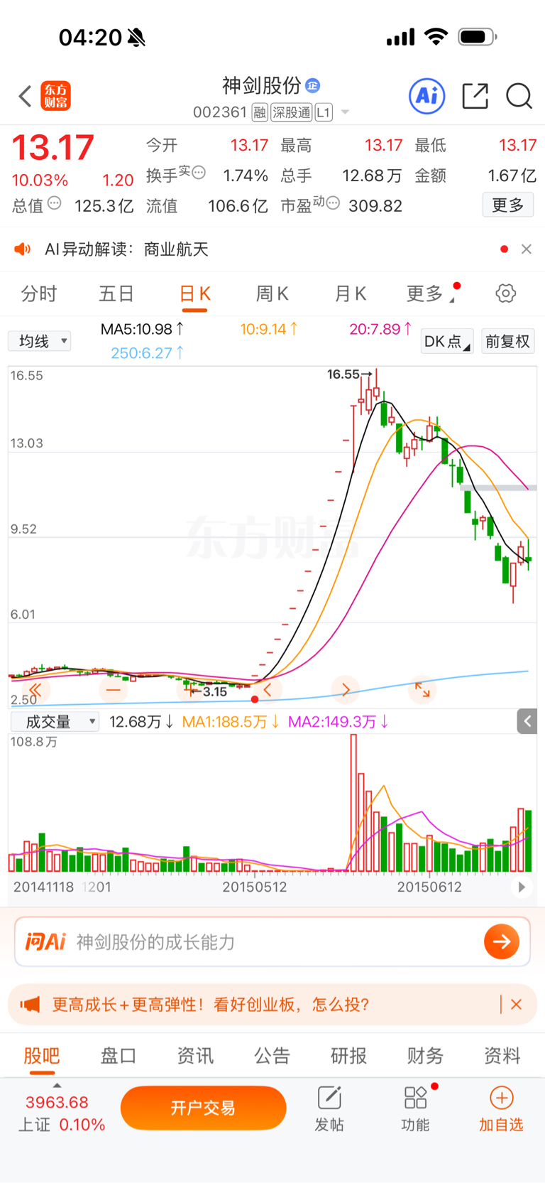 $神剑股份(SZ002361)$ 十年磨一剑,上次是13板,这次有多少个板?