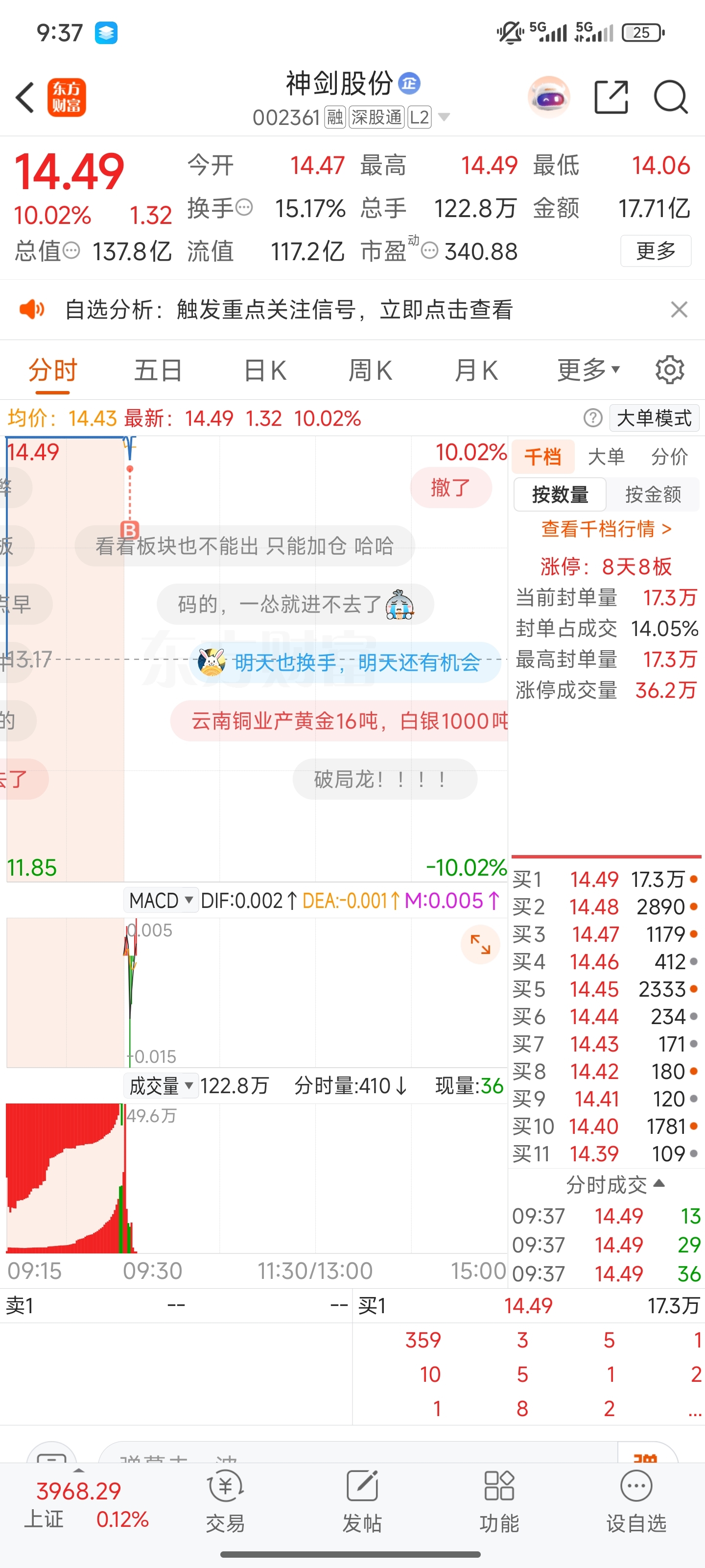 $神剑股份(SZ002361)$ $大业股份(SH603278)$ 真的气死我了,在火车上手机卡了,9.30手机直接显示不动弹,搞的没有买进大业股份,只能买神剑了。