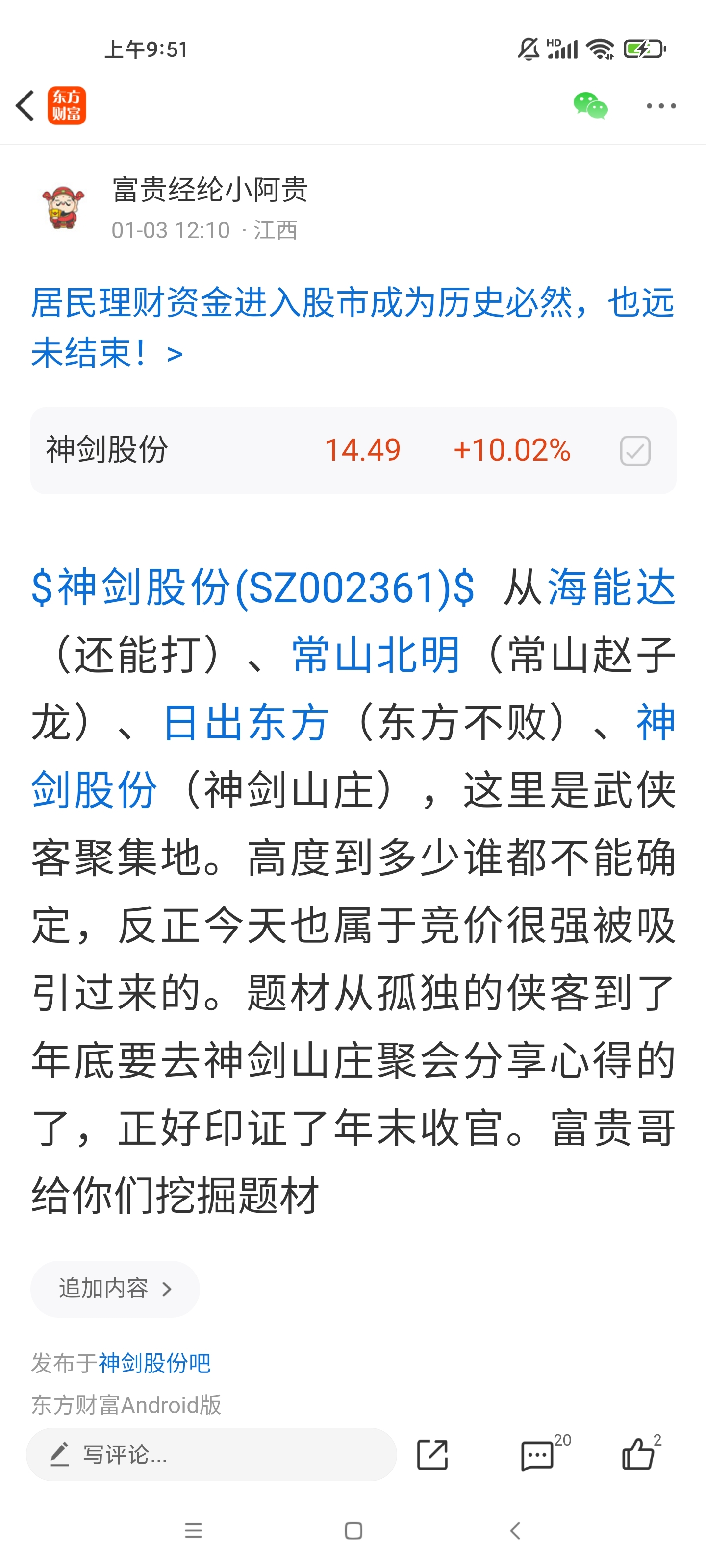 $神剑股份(SZ002361)$ 没办法,去年最看好神剑接替日出东方的,没耐心埋伏然后打板接力被洗了我今天又上车了。主力是真的坏我4块钱犹豫了一年没敢买就怕他横盘耽误时间,神剑山庄是去年常山赵子龙→日出东方不败→神剑山庄谢晓峰