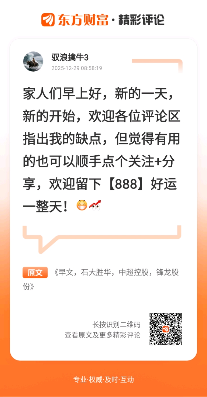 //@驭浪擒牛3 :家人们早上好,新的一天,新的开始,欢迎各位评论区指出我的缺点,但觉得有用的也可以顺手点个关注+分享,欢迎留下【888】好运一整天!