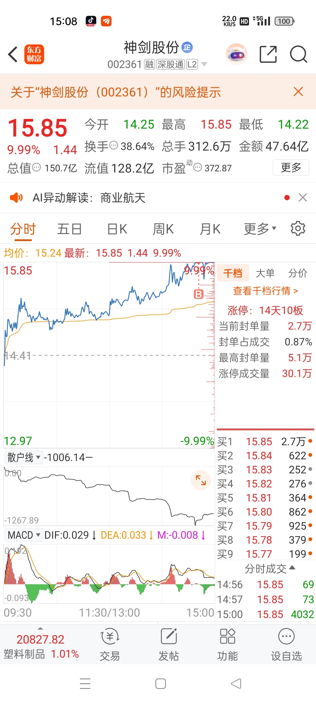 $神剑股份(SZ002361)$ 越高越安全,明天还有肉肉。从筹码分布来看,昨天11%,今天8%左右,明天吃5个点走人。