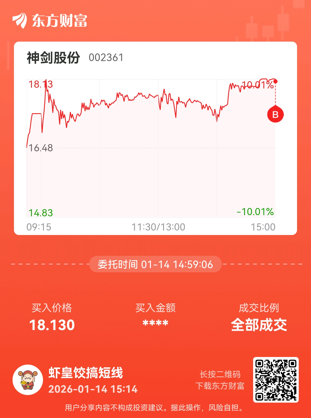 下午在金风挂2个点,一直没卖出去,拖了拖结果一看神剑都快涨停了,干脆尾盘竞价进来