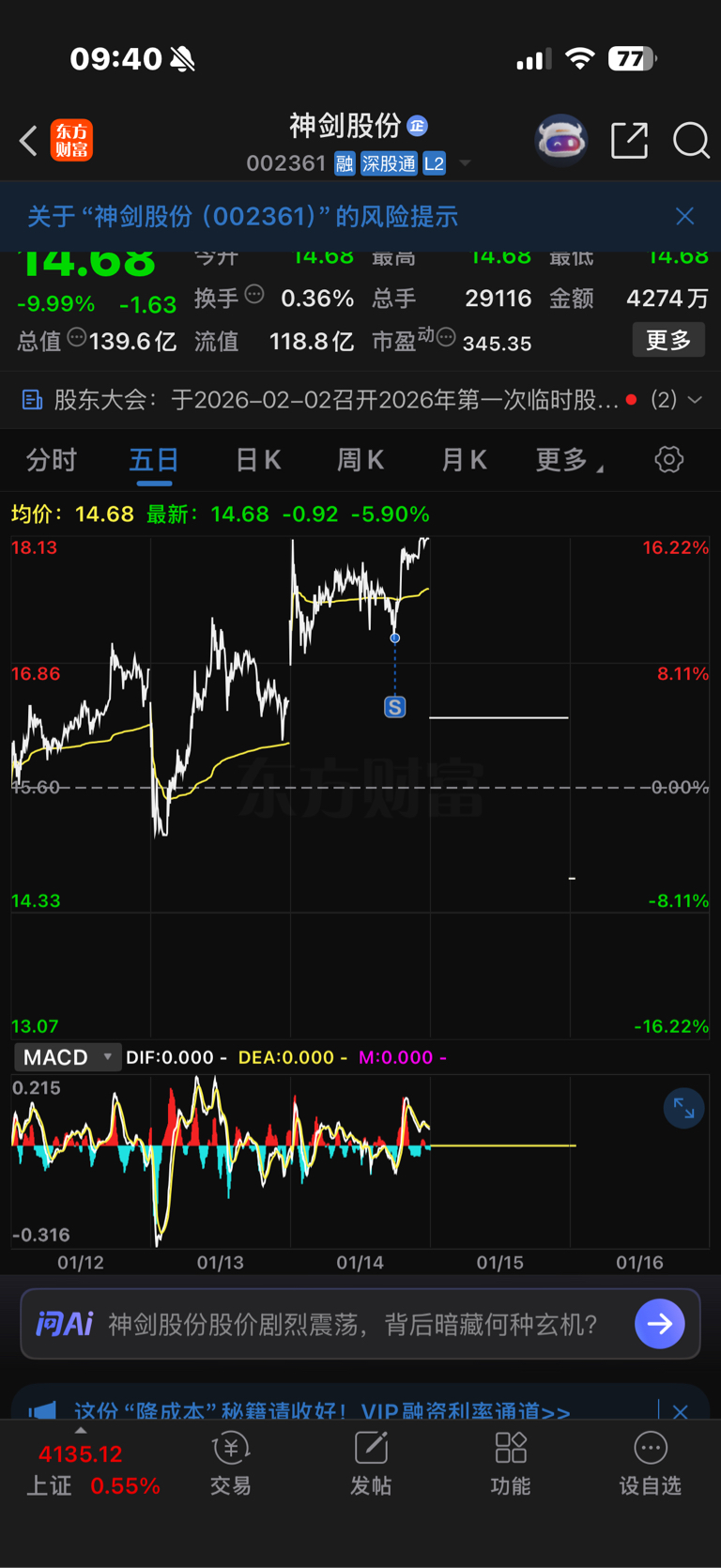 $神剑股份(SZ002361)$ 想想都后怕,前天还在怪自己卖到最低点,现在想起来真是塞翁之马焉知非福
