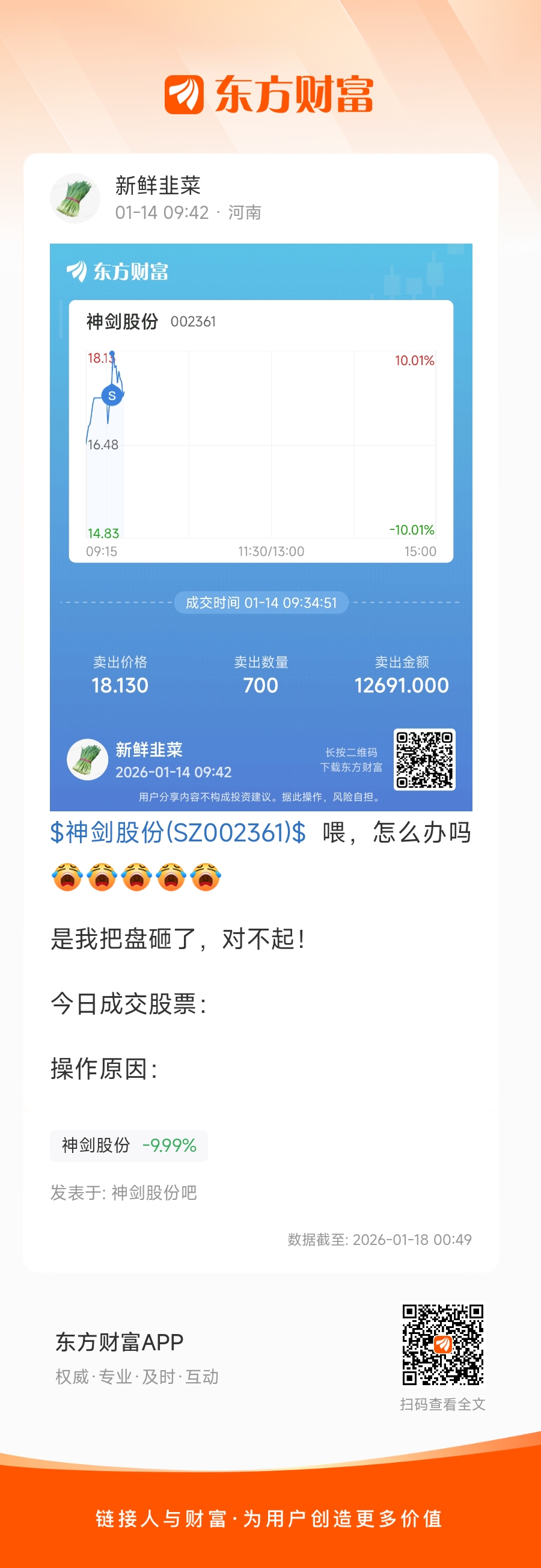 温馨提示: 1.根据《证券法》规定,禁止编造、传播虚假信息或者误导性信息,扰乱证券市场;2.用户在本社区发表的所有资料、言论等仅代表个人观点,与本网站立场无关,不对您构成任何投资建议。用户应基于自己的独立判断,自行决定证券投资并承担相应风险。《东方财富社区管理规定》