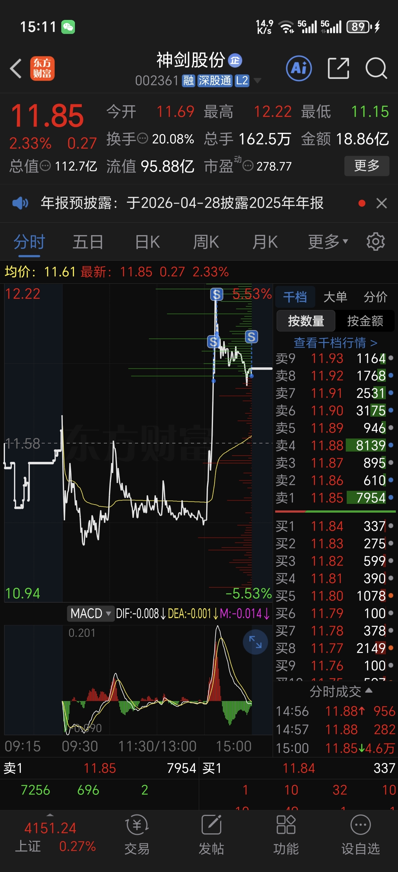 $神剑股份(SZ002361)$ 11.26不敢加仓