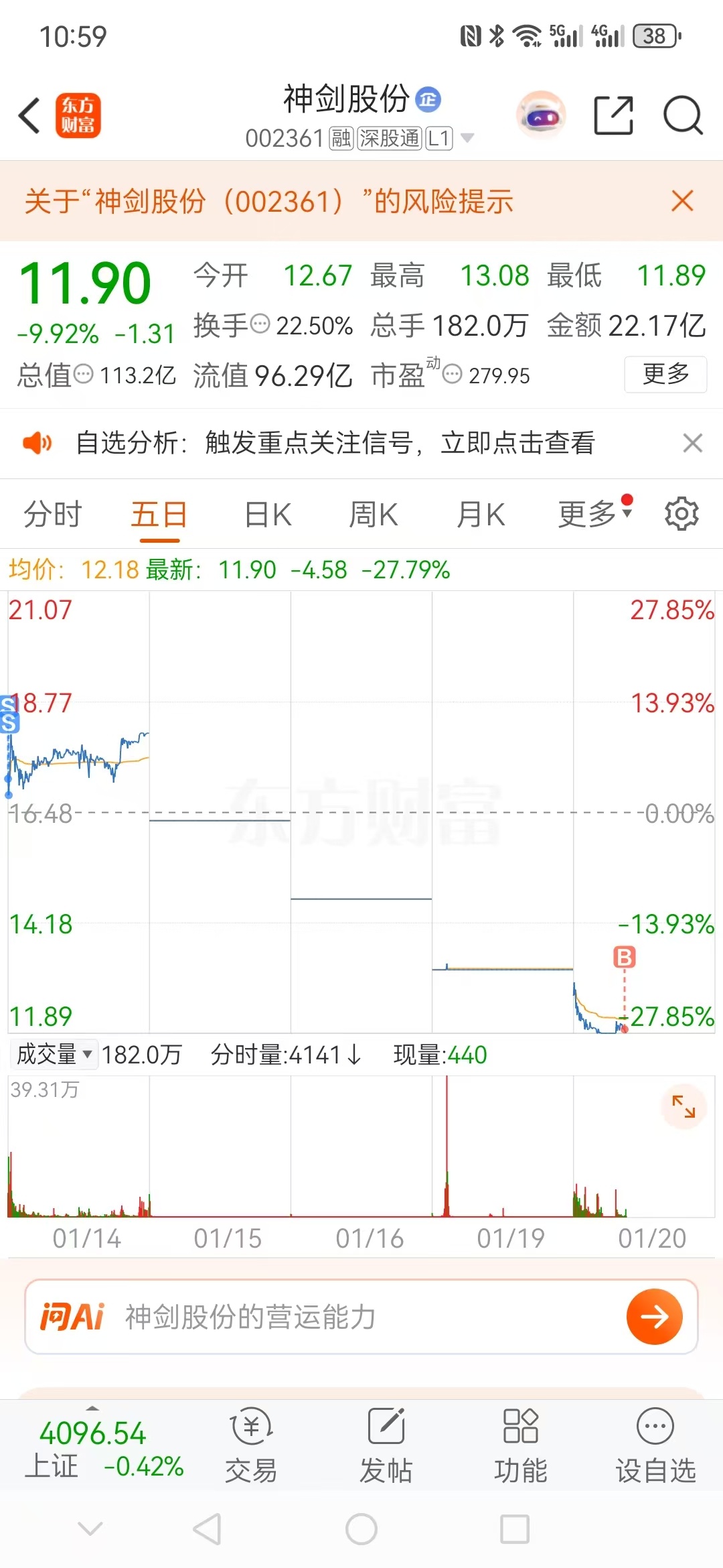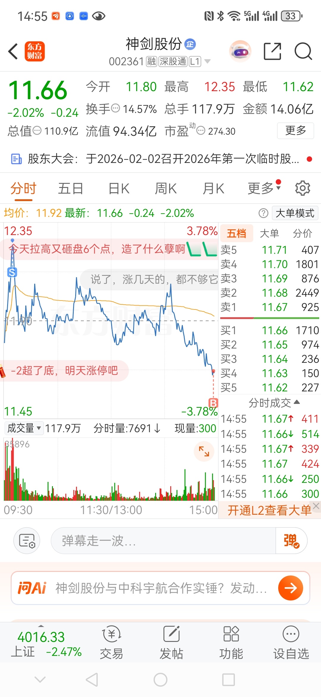 还是坚定看好商业航天,目前手头只有神剑股份一只票了。从最近盘面在走势来看,我判断神剑的主力还是洗盘吸筹阶段,最近外围情绪冰点,神剑还有几次上冲的表演,已经很好了,后续只需板块情绪回暖,有机会再次起飞。