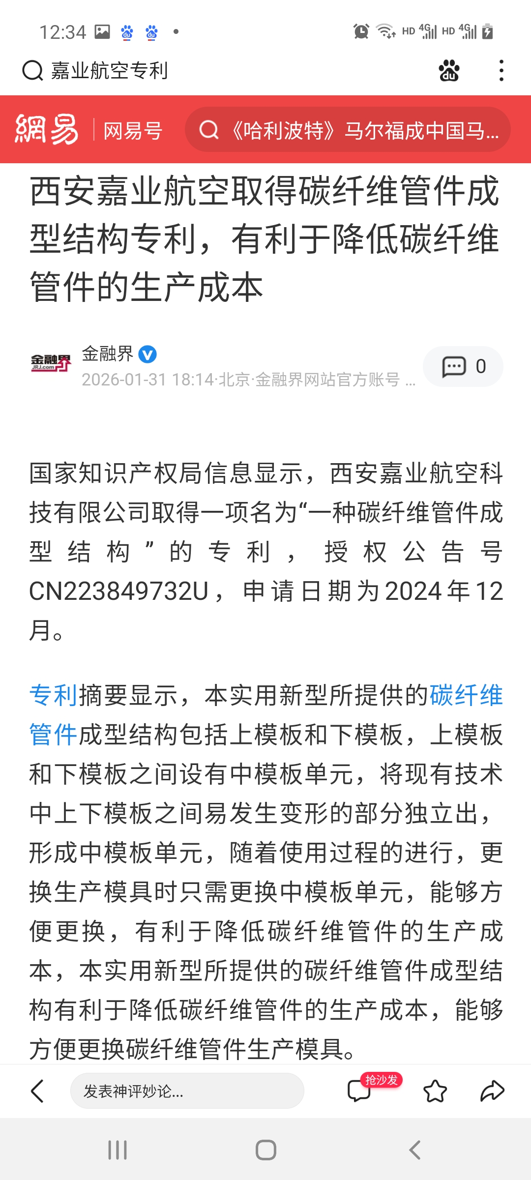 嘉业航空碳纤维管件最新专利