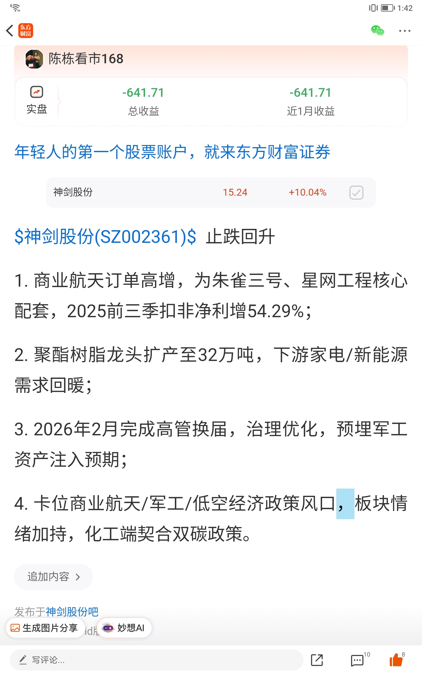 $神剑股份(SZ002361)$ 早上没开盘就发出来说止跌回升,午后强势涨停,恭喜自己喜提一个板板哈哈