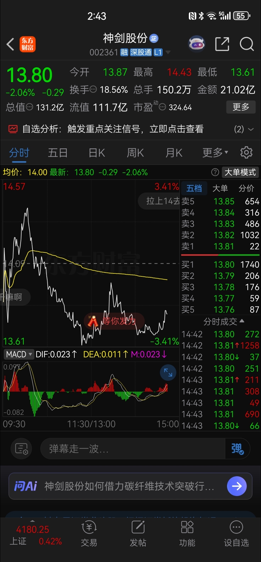 $神剑股份(SZ002361)$ 画了个线,漂亮