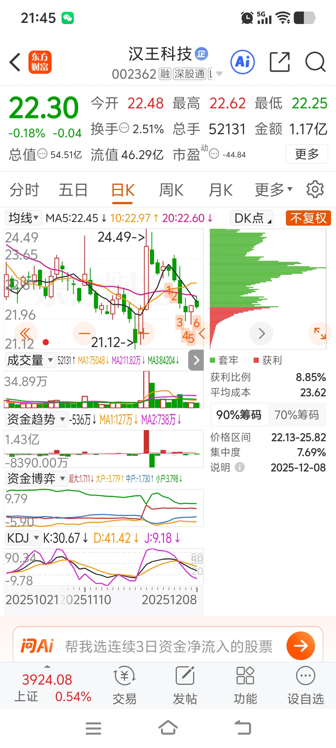 $汉王科技(SZ002362)$ 近期倍量试盘,后缩量回调,上周四跌穿试盘线启动价,周五收回,今天高开冲高回落,基本上低价收盘,倍量,试盘,缩量,高开,从今天分时线看,高开冲高回落基本最低价收盘,主力吸筹迹象很明显!