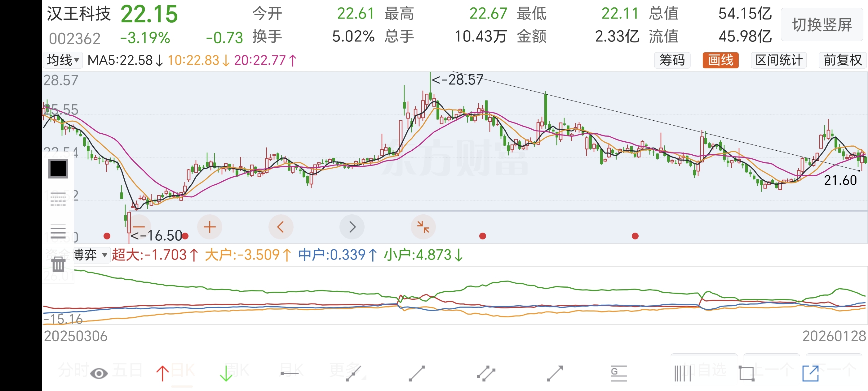 $汉王科技(SZ002362)$ 此票突破下降通道后回踩趋势线,必须上车啊,今天盯住这只票,支撑位21.61。今天能否给机会上车?来个大跌吧,我要上车。