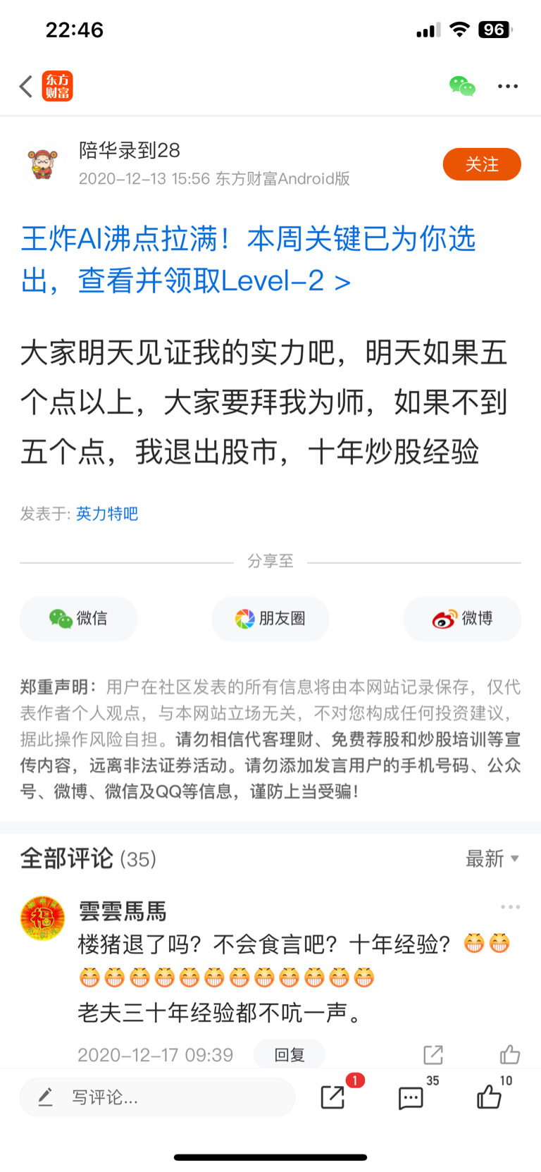 温馨提示: 1.根据《证券法》规定,禁止编造、传播虚假信息或者误导性信息,扰乱证券市场;2.用户在本社区发表的所有资料、言论等仅代表个人观点,与本网站立场无关,不对您构成任何投资建议。用户应基于自己的独立判断,自行决定证券投资并承担相应风险。《东方财富社区管理规定》