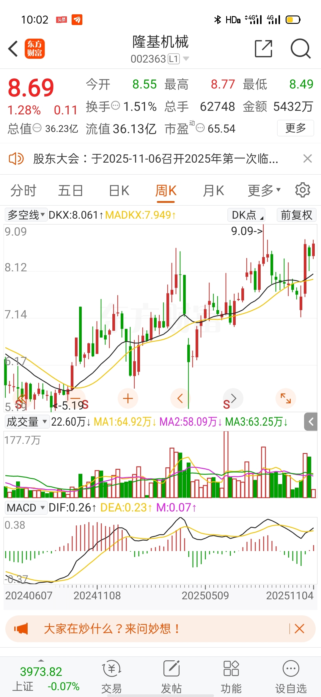 上周线最高8.78着周8.77跑